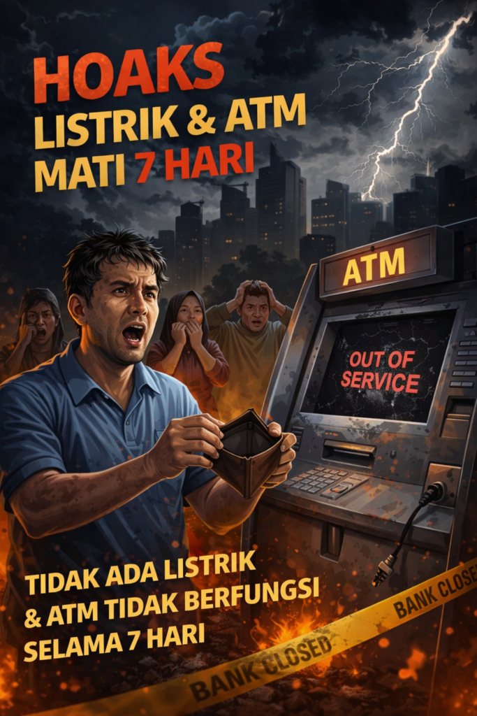 Sebuah informasi yang viral di TikTok, Facebook, WhatsApp, dan platform media sosial lain mengklaim bahwa listrik nasional dan layanan ATM di Indonesia akan mati total selama tujuh hari berturut-turut sebagai akibat dari krisis global — bahkan isu tersebut dikaitkan dengan perang dunia atau konflik antara Amerika Serikat dan Iran.